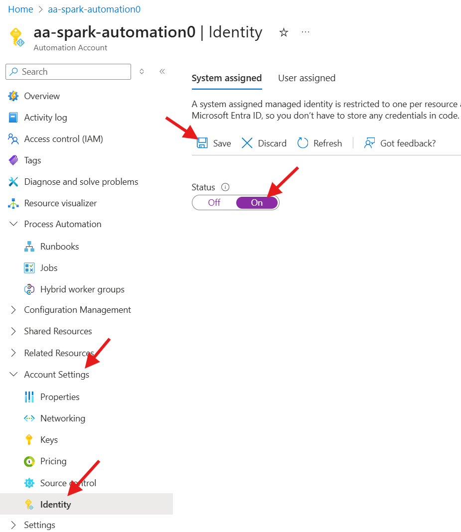 - Under the System assigned tab, turn the Status to On
