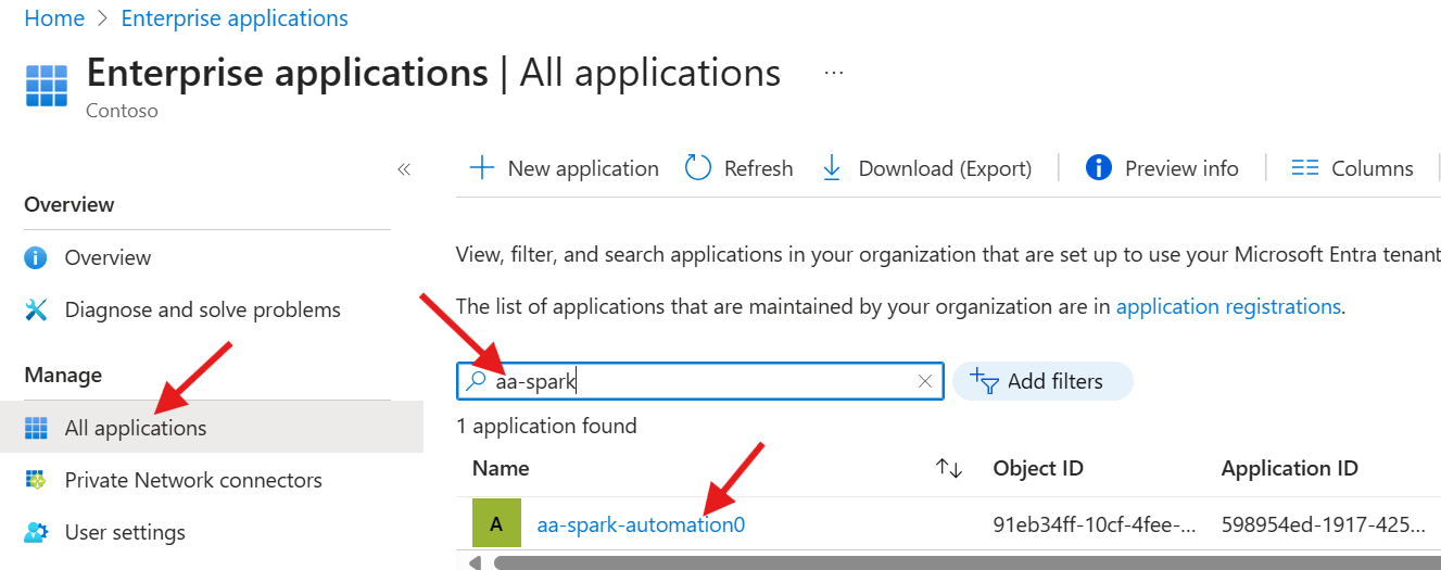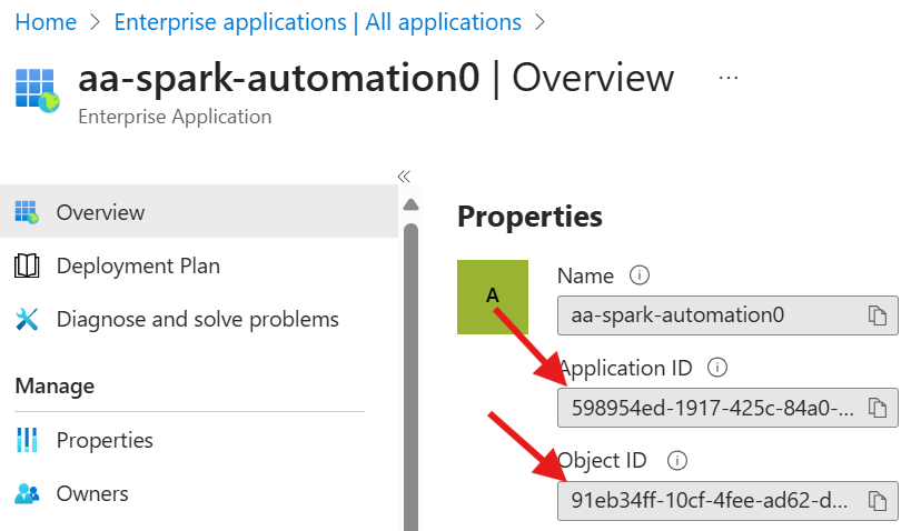 - SAMI objID: The object id of the aa-spark-automation0 enterprise application
