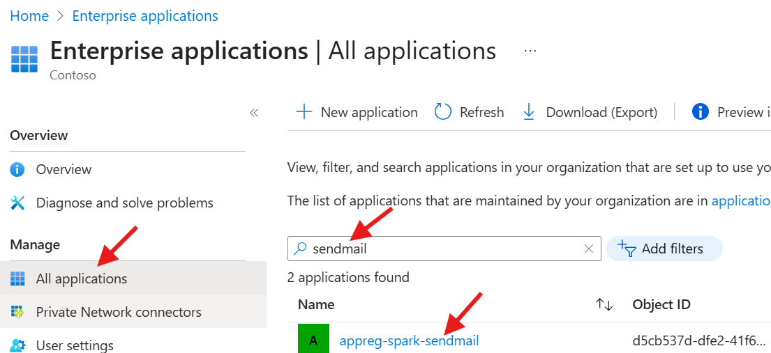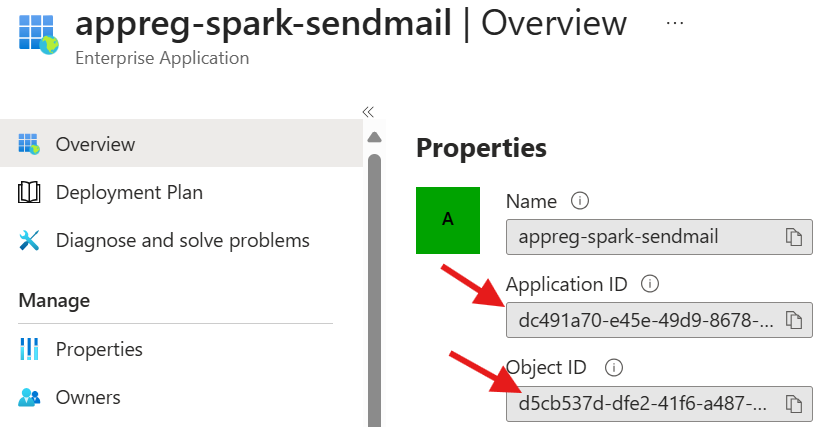 - SendMail objID: The object id of the appreg-spark-sendmail enterprise application