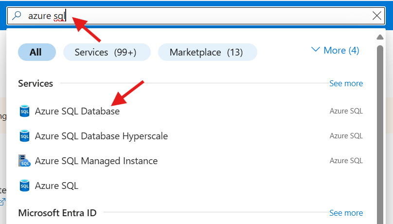 azure sqlin the top search textbox- Select