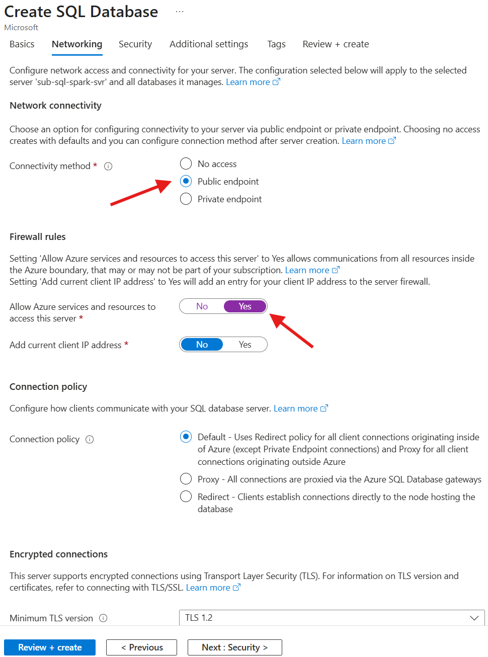 | Allow Azure services and resources to access this server | Yes |