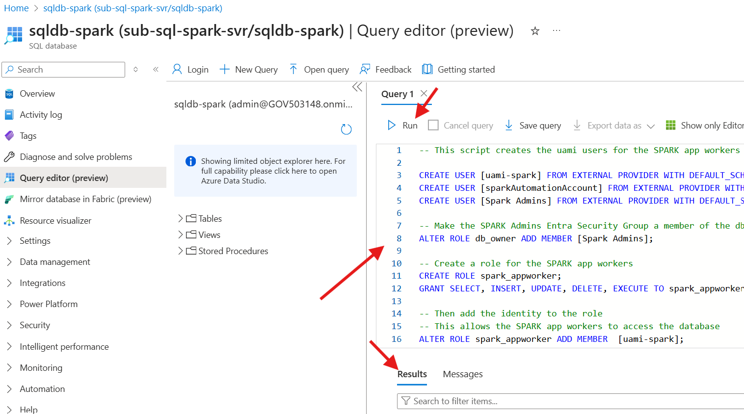 - From the query editor, run the following scripts in the order shown in the table below