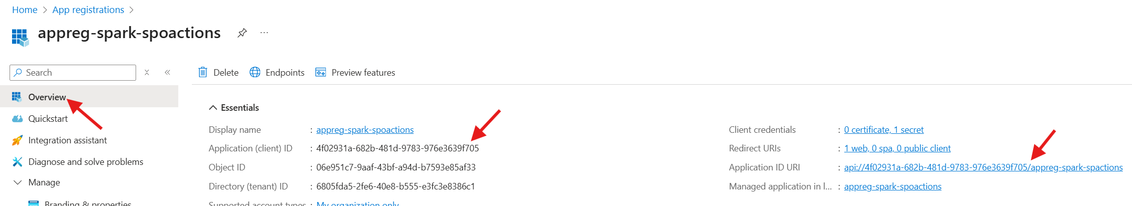 - From the Overview section, annotate the Client Id and Application ID URI values for the next step
