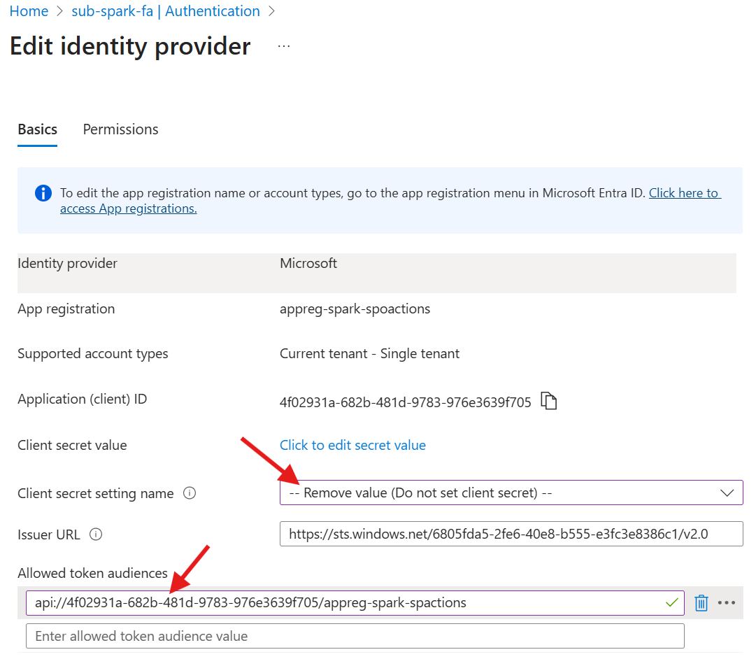 8. Set the Allowed Token Audiences value to the appreg-spark-spoactions application id uri