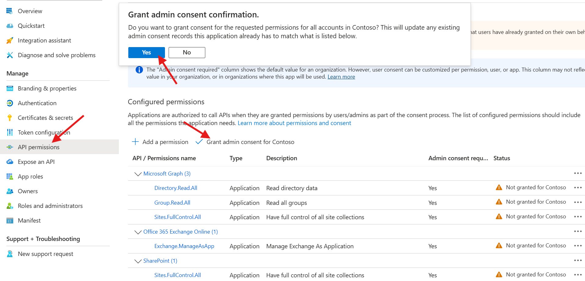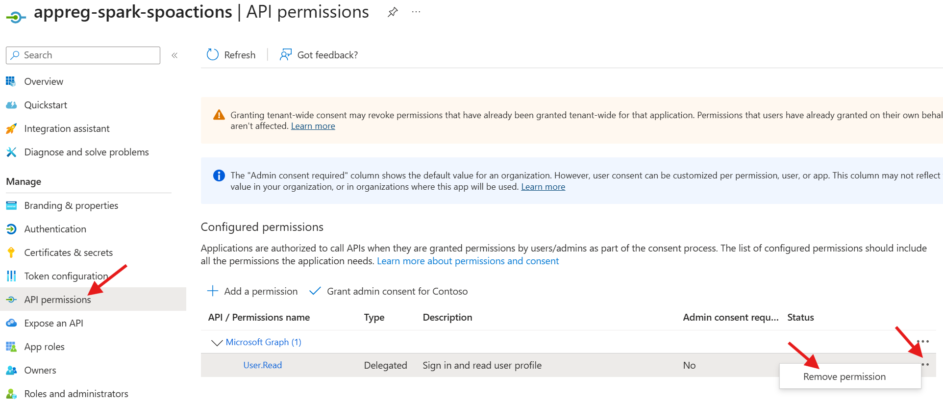 10. Click the Grant admin consent for Contoso to approve the request